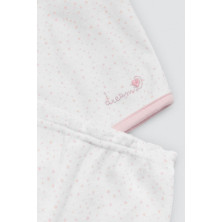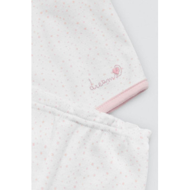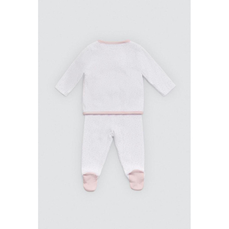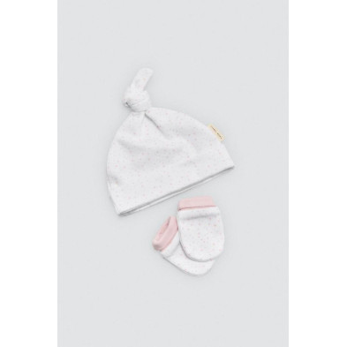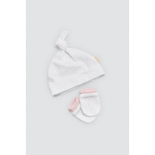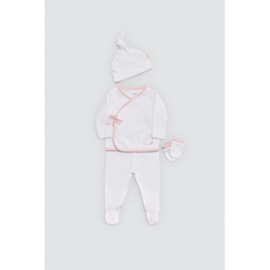 Pack de bebé para la primera puesta de un recién nacido de algodón natural. El conjunto incluye cuatro piezas esenciales: una camiseta de manga larga, polaina, gorro y manoplas