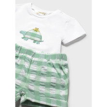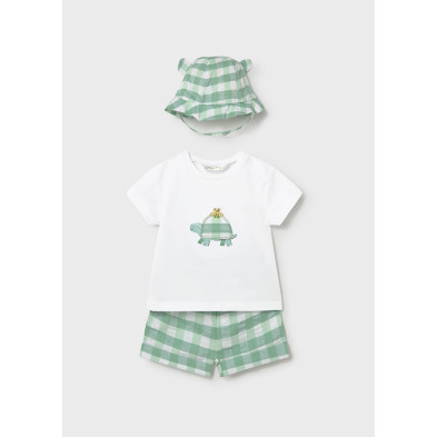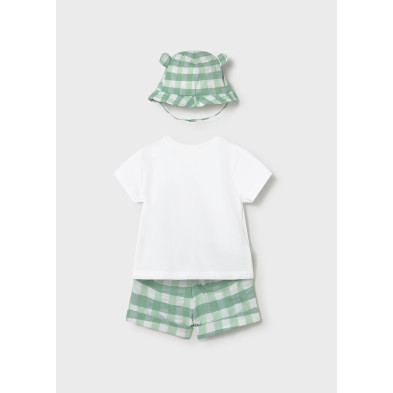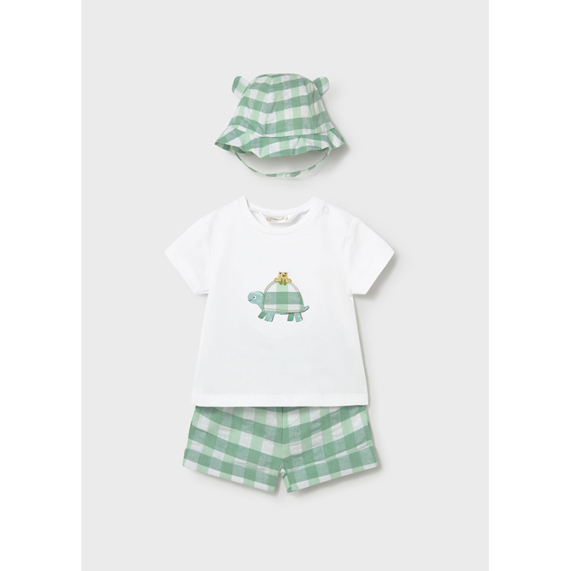 Conjunto bebé de camiseta, pantalon corto y gorro a juego.