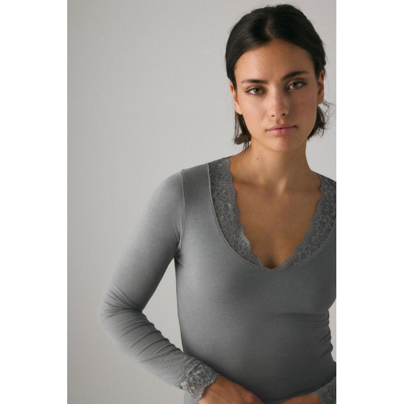 Colección Romantic Boheme. Camiseta de manga larga de algodón con encaje en el escote y las mangas. Cuello en pico.