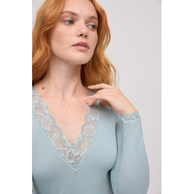 Camiseta manga larga de algodón natural con detalle de encaje en el escote y los puños de las mangas