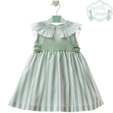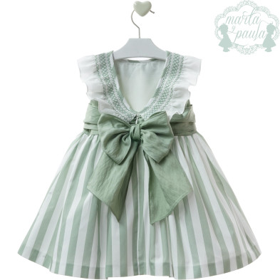 Vestido en tono verde con corte en la cintura , tejido falda en rayas anchitas y cuerpo tono verde acabado en pico en la espalda con cuello en nido de abeja blanco y gran lazada en la espalda. Ideal para celebraciones y días especiales.