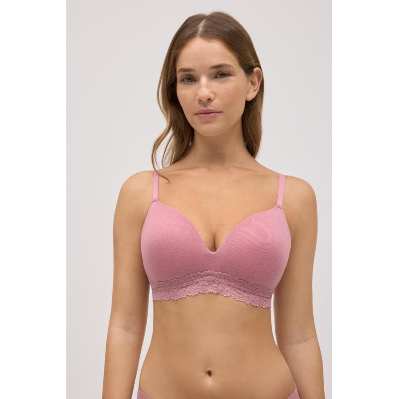 Sujetador de tejido canalé sin aro y con relleno. Detalle de ribete de encaje..